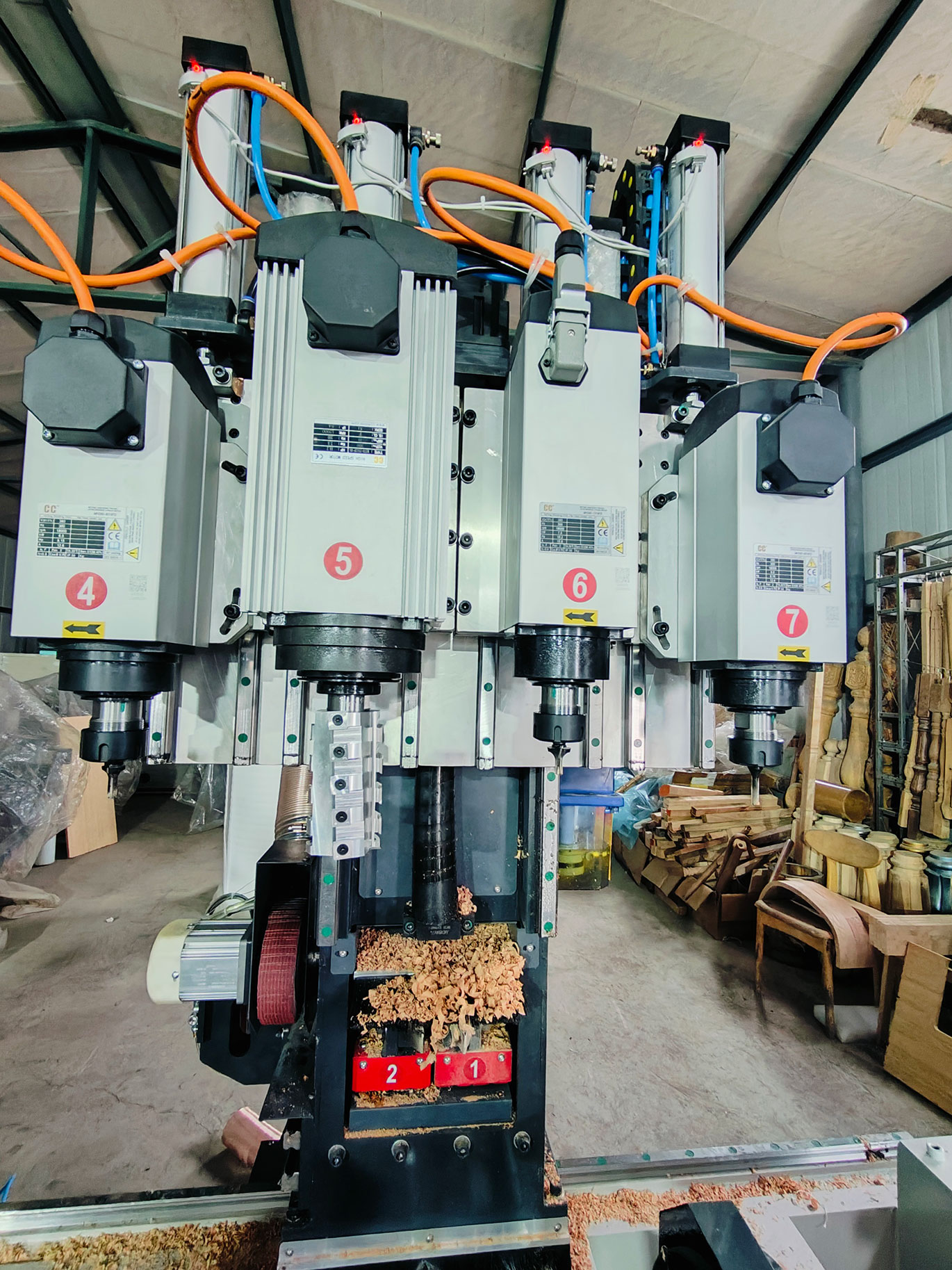 四軸7工序車銑復(fù)合加工中心,自動上料、自動打磨、雙刀車木、4個主軸電機(jī)(根據(jù)不同需求安裝不同功能刀具,左右側(cè)電機(jī)可擺動角度加工0-15度斜孔)。更多功能,可完成更復(fù)雜工序,車圓、銑型、拉槽、打孔、打磨等功能一次成型,適用于實木桌椅腿、沙發(fā)腿 、床腿、各種實木家具腿、樓梯木欄桿等旋轉(zhuǎn)木制品的加工。
