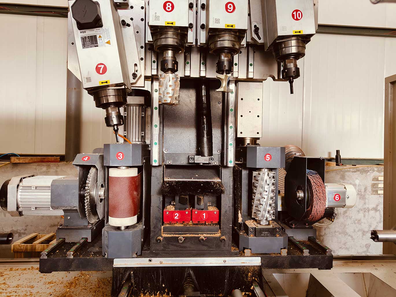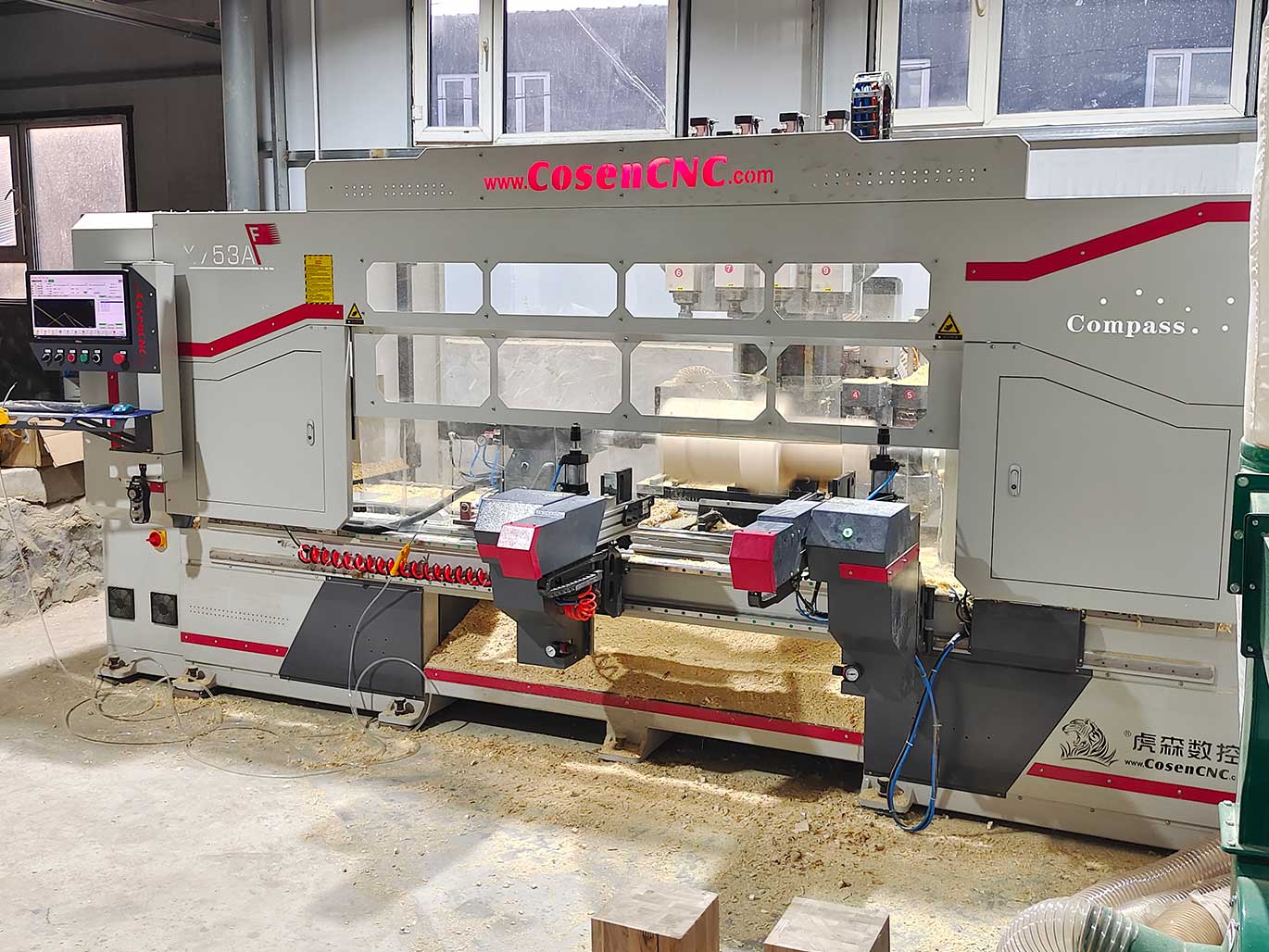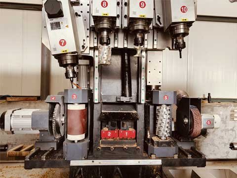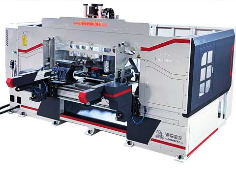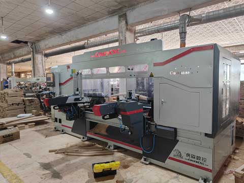設(shè)備特點:這是一款四軸10工序車銑復(fù)合加工中心,可實現(xiàn)自動上料、雙刀車木、立柱刨銑、圓砂打磨、鋸片大吃刀量切削、四工序主軸(可實現(xiàn)打孔、倒角、拉線、榫槽、榫孔、鏤空、雕刻等功能,兩側(cè)主軸電機可手動調(diào)整角度實現(xiàn)15度以內(nèi)斜孔加工),此型號設(shè)備功能更多,配置更齊全,適合加工更加復(fù)雜的工件,如臺球桌腿、異形復(fù)雜實木家具工件、實木家具腿等一次成型。